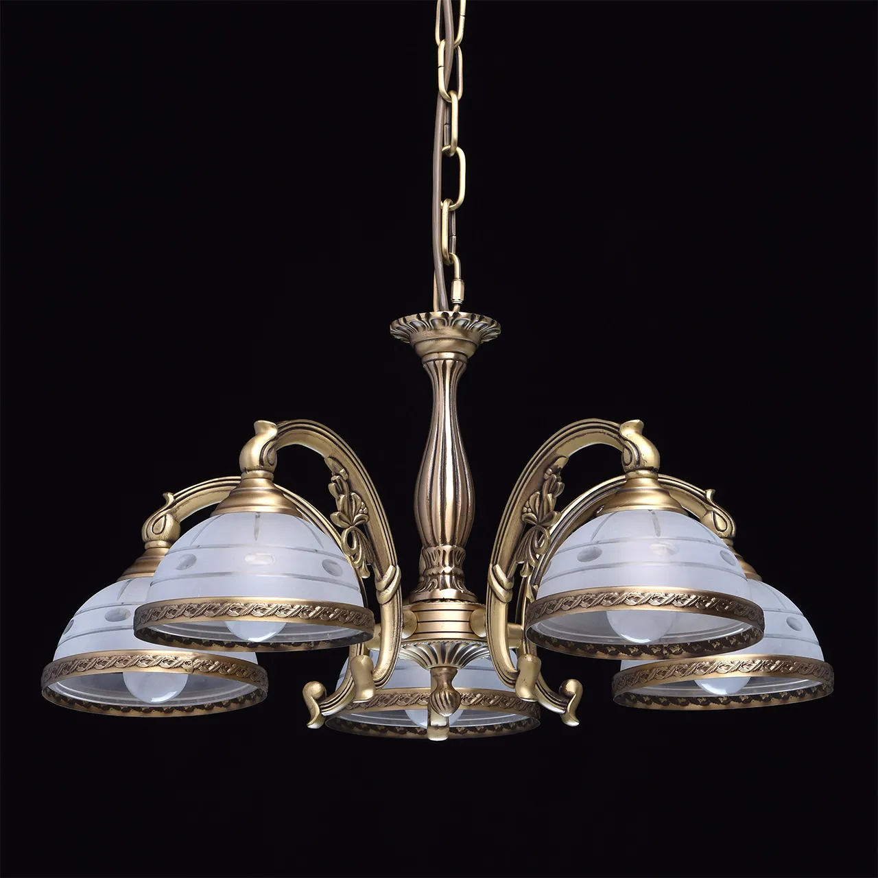Основание из латуни, стеклянные плафоны с резным узором.