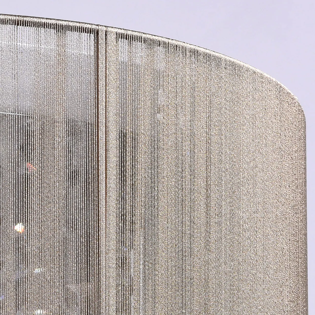 Металлическое основание цвета хрома, абажур, обтянутый тонкими нитями золотого цвета, декоративные э